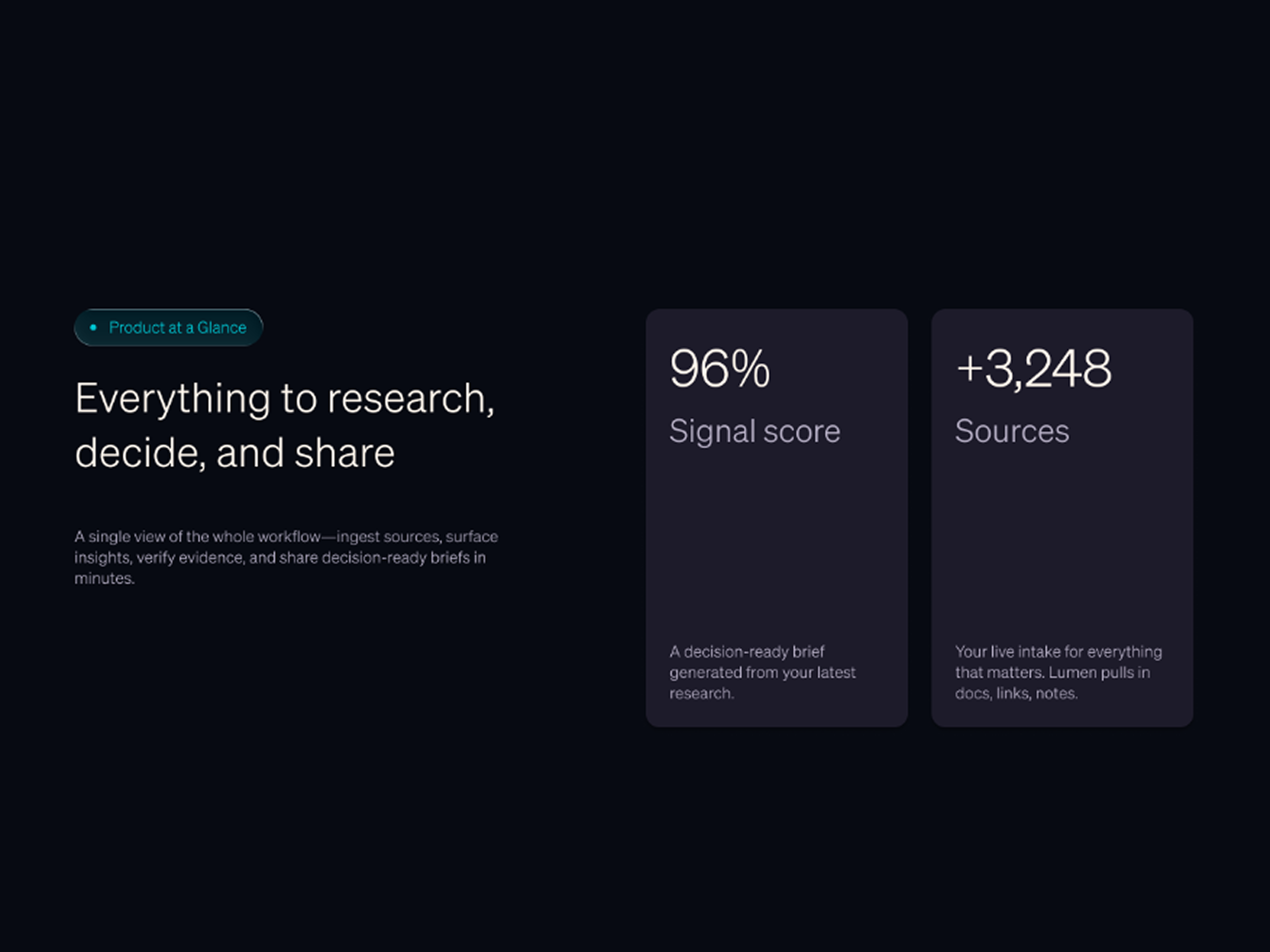 Lumen is a high-conversion, dark-mode landing page template built for AI-driven research startups.